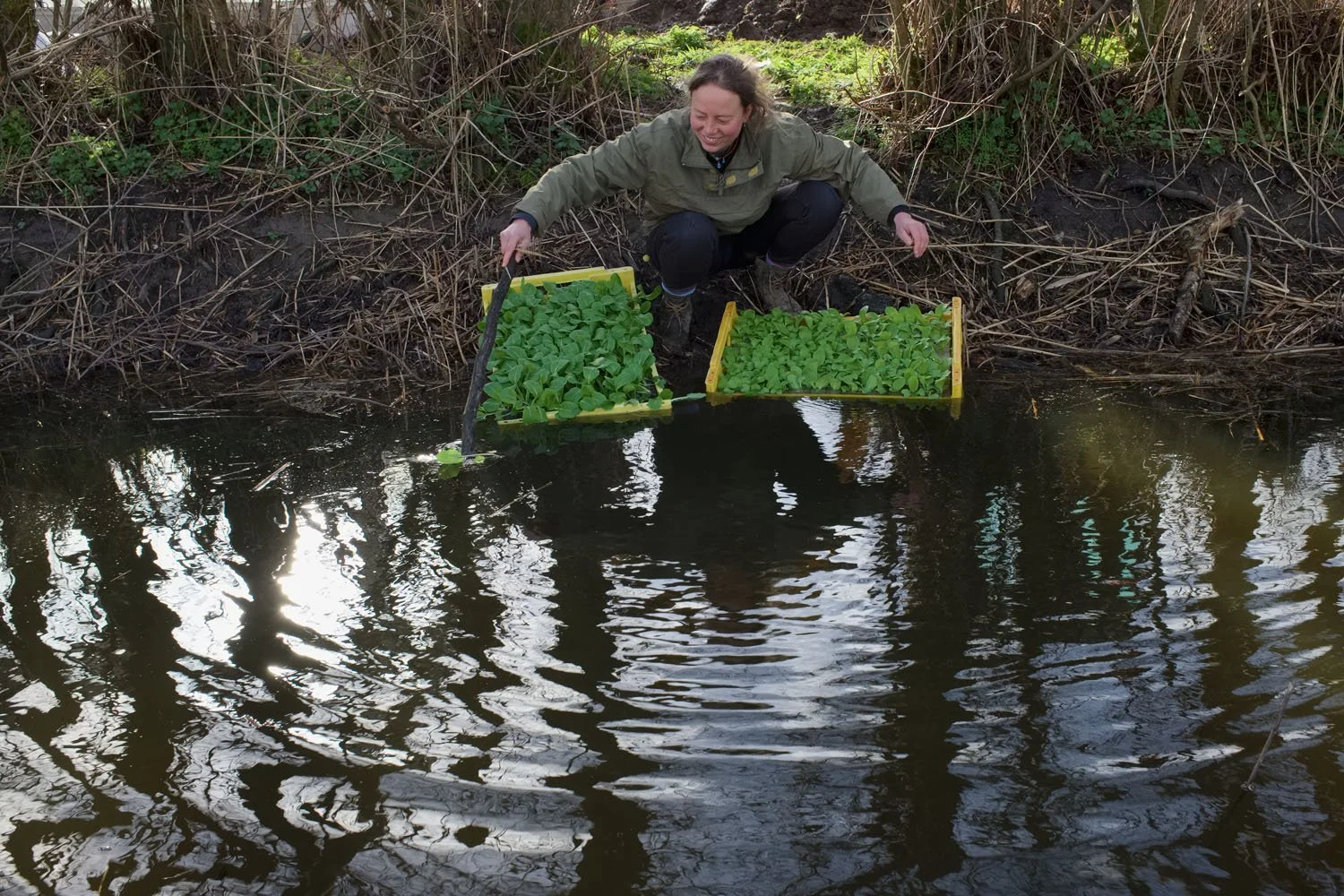 Until the irrigation system is installed, gardener Matty soaks grow boxes full of seedlings in a ditch adjacent to the Proeftuin before planting them. With a stick she retrieves a celery plant that has floated away. March 2023