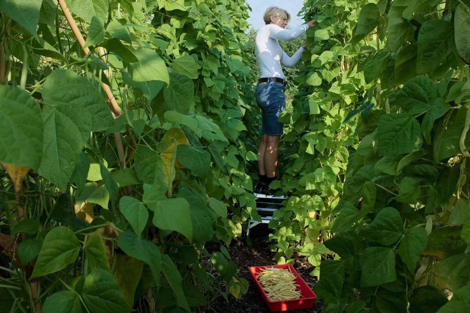 Andrea, who has just started as a volunteer at the Proeftuin, picks yellow string beans. At this Dutch ecological market garden only seasonal vegetables and fruits are grown. August 2022