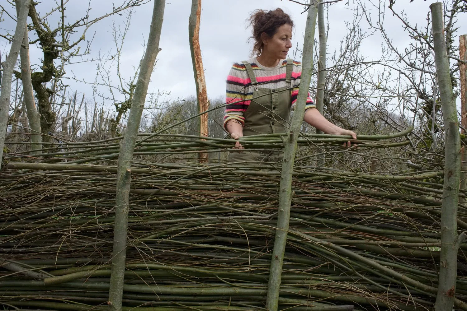 Natascha builds a screen of branches from newly pollarded willows. It will give more privacy to tenants of the holiday cottage behind her and also offers a shelter and nesting place for insects and birds. March 2024