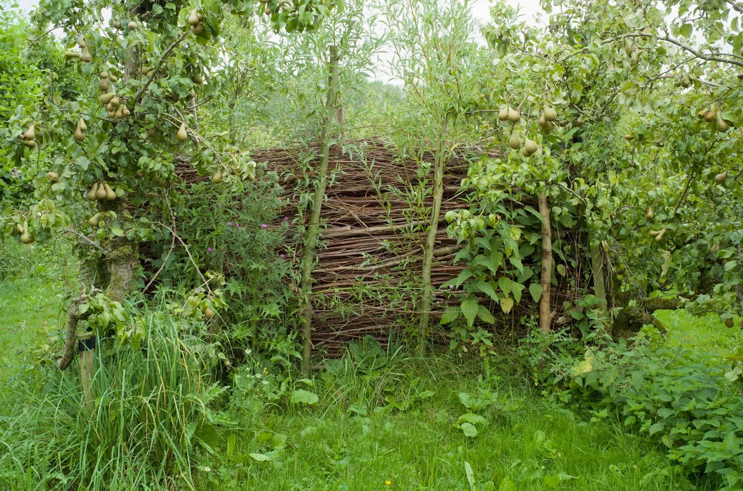 The screen that was braided of willow branches sprouts leaves and the pear trees bear fruit. Juli 2024