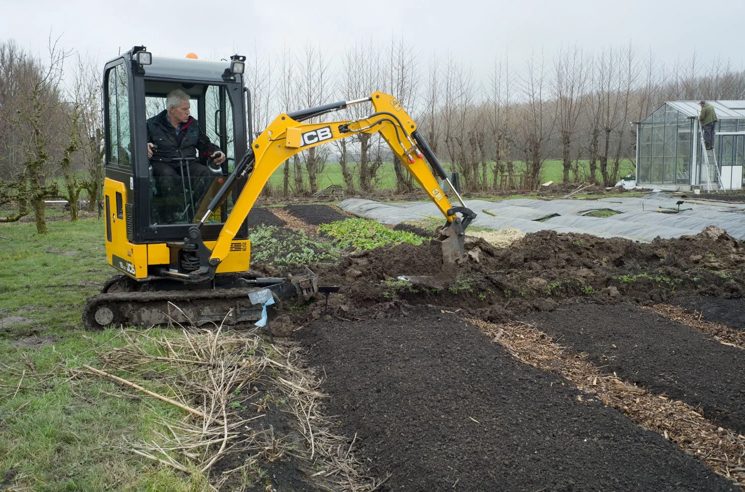 With a lightweight excavator, which impacts the soil as little as possible, trenches are dug for irrigation pipes and power lines. On the right a greenhouse is being built. February 2023