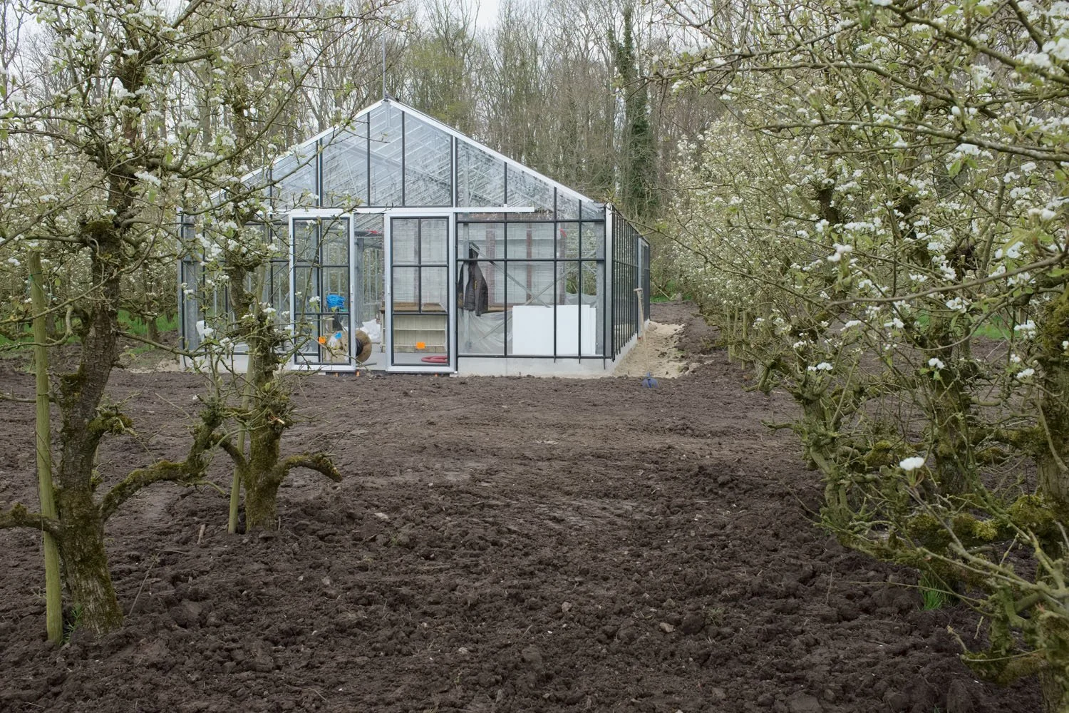 Over a hundred old pear trees have been dug out – root ball and all – to make way for a large greenhouse, two eco-lodges and fruit bushes. They will be replanted elsewhere. February 2023