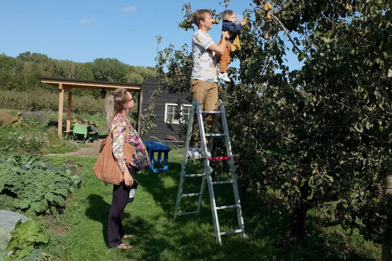 A father helps his son picking pears. The family visits the garden during a bicycle tour. September 2023