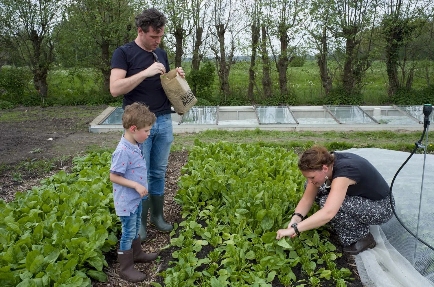 A family self-harvests spinach for the first time. The leaves are collected in a recycled bag given to them by the gardeners that says in Dutch: “City Bakery, Firm Bread”. May 2023