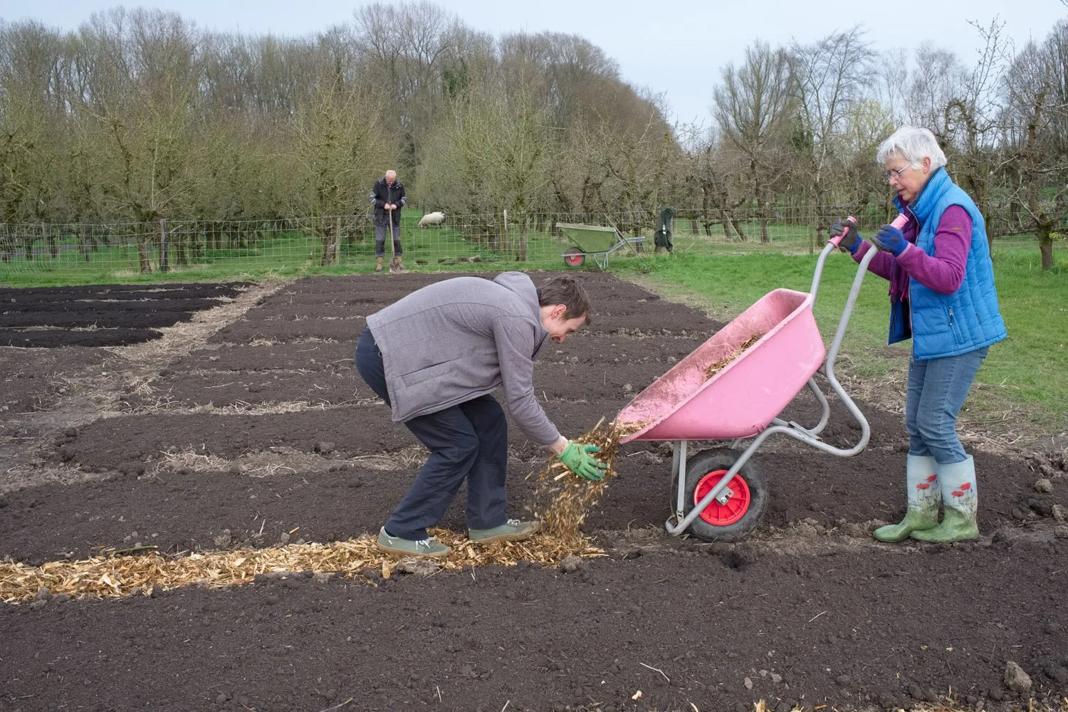 Volunteers Wouter and Jannie make paths with wood chips between new potato beds covered with a fresh layer of compost. In the background, Maarten straightens the grass edges of the new beds. March 2024
