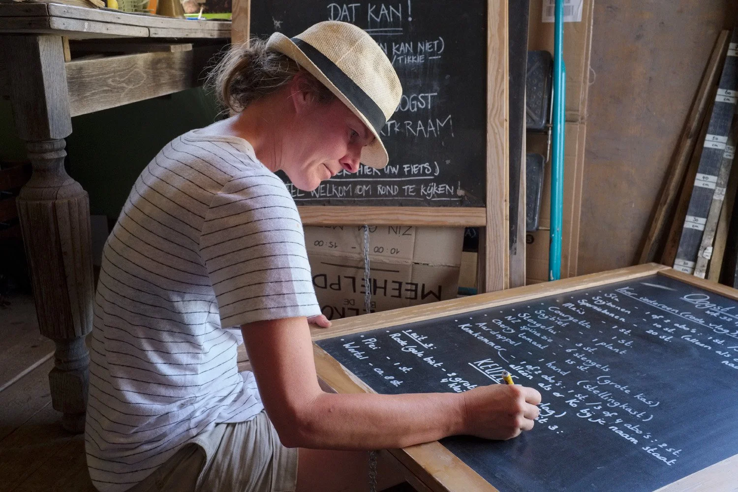 Gardener Jantien sits on the tool shed’s floor, writing a list of vegetables that CSA members can harvest, and the quantities allowed, on one of the information boards of the Proeftuin van Linschoten. August 2024