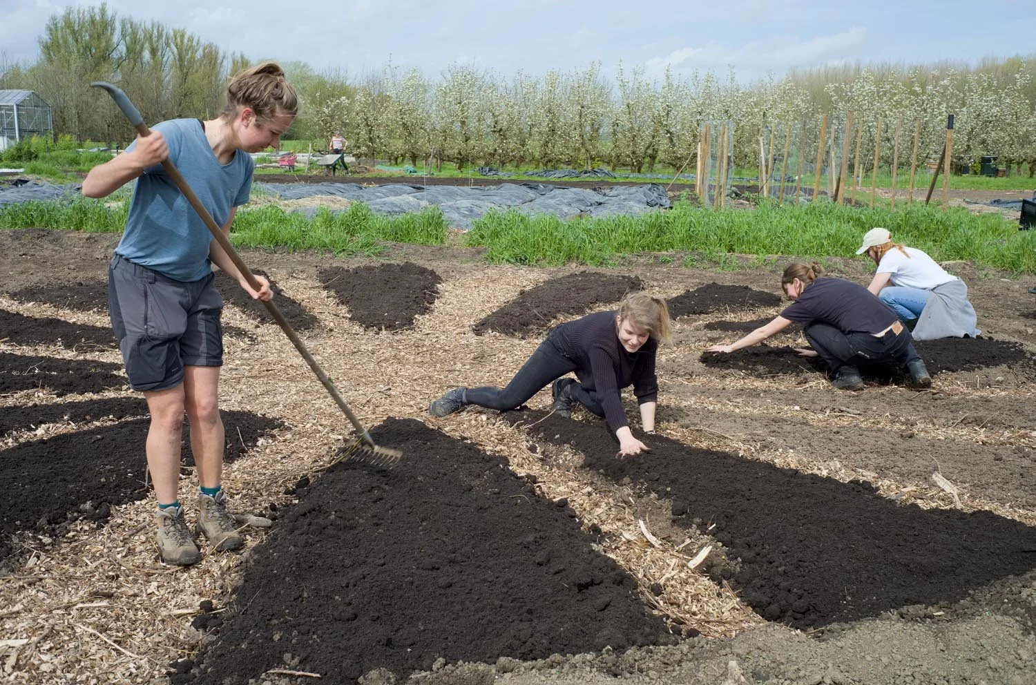 In May of that year, new gardeners Matty Vink and Emma Smeets, both recently graduated from a biodynamic agricultural college, were able to sow and plant, thanks to the sale of the first CSA (Community Supported Agriculture) shares. Since customers pay for their produce up front for the entire growing season, the garden can invest in seed, seedlings, compost and tools without having to borrow money.
