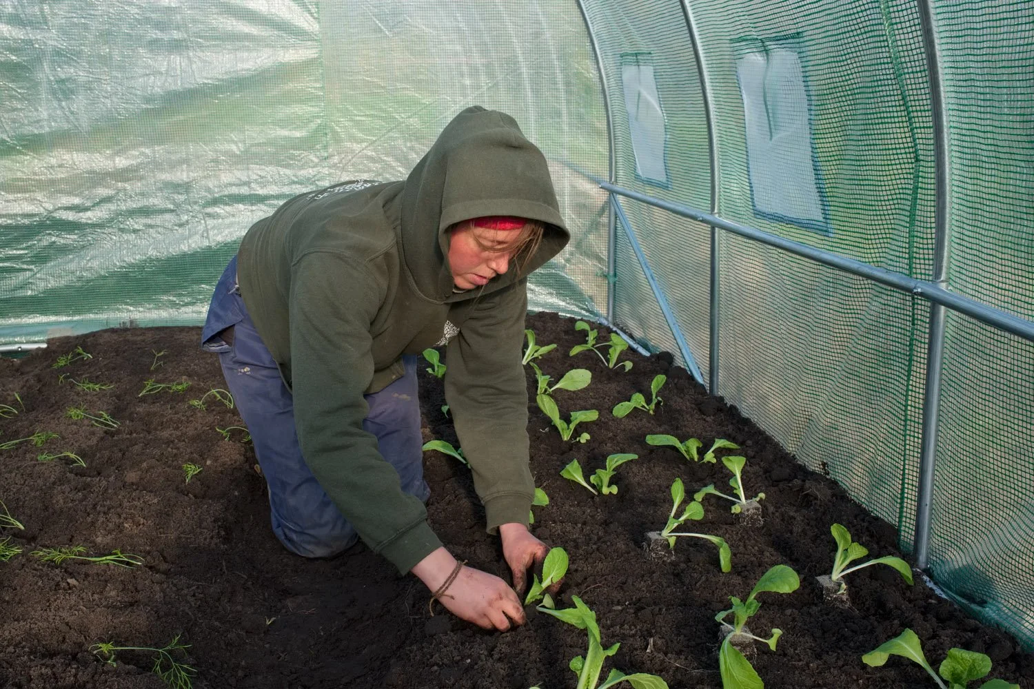 Gardener Matty plants peppers in one of the tunnel greenhouses. When the weather is still bleak, vegetables can already be grown here, which extends the growing season. March 2024