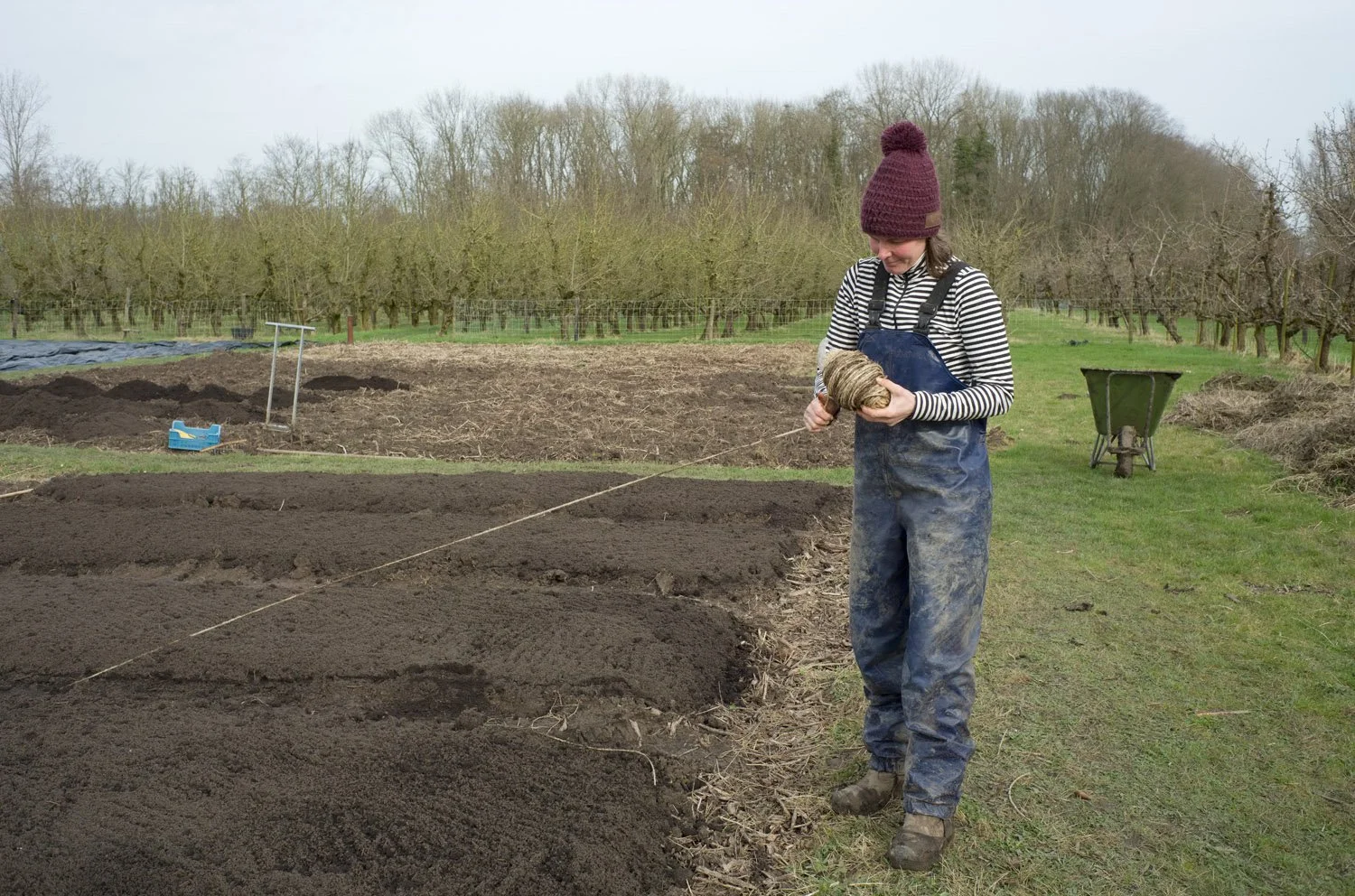 Jantien rolls up the rope with which she had indicated the new beds. Those are covered with compost and ready to plant potatoes in. February 2024