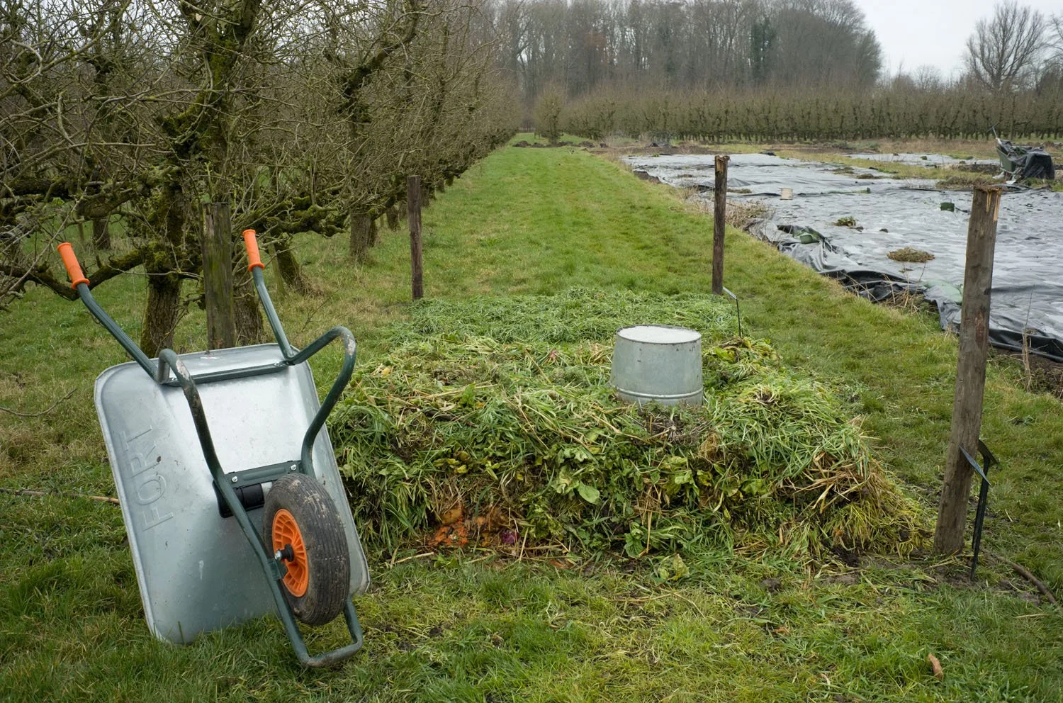 Clay retains water, but also many nutrients that are not directly absorbable by plants. For this they need the help of soil life, and in the old orchard that was hardly present anymore. The gardeners therefore do everything they can to stimulate this in the cultivation beds, by feeding the soil with organic substances, but also leaving it alone as much as possible. No plowing or turning, at most the compact clay is loosened up with the spading fork.