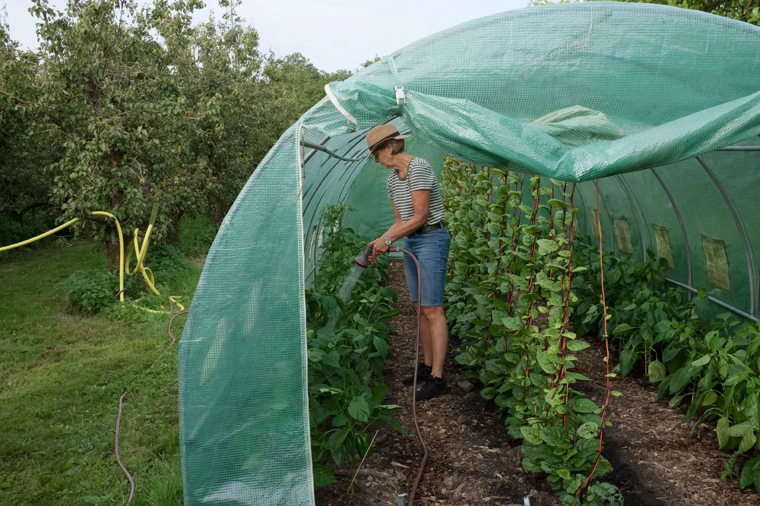 Volunteer Andrea waters peppers and malabar spinach in one of the two tunnel greenhouses. July 2024