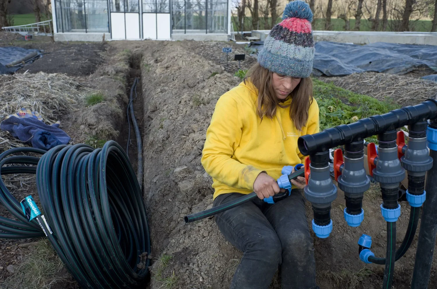Gardener Emma installs the flow system for nozzles and drip irrigation. Long channels have been dug into the river clay throughout the garden to install underground water hoses and electricity. March 2023