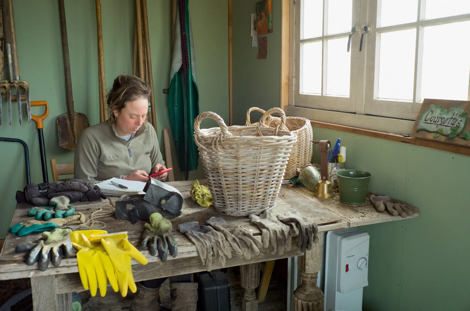 Matty checks the cultivation plan on her mobile phone in the work shed. Her new colleague Jantien, who joined the garden team in the 2024 growing season, first sorted all garden gloves. February 2024