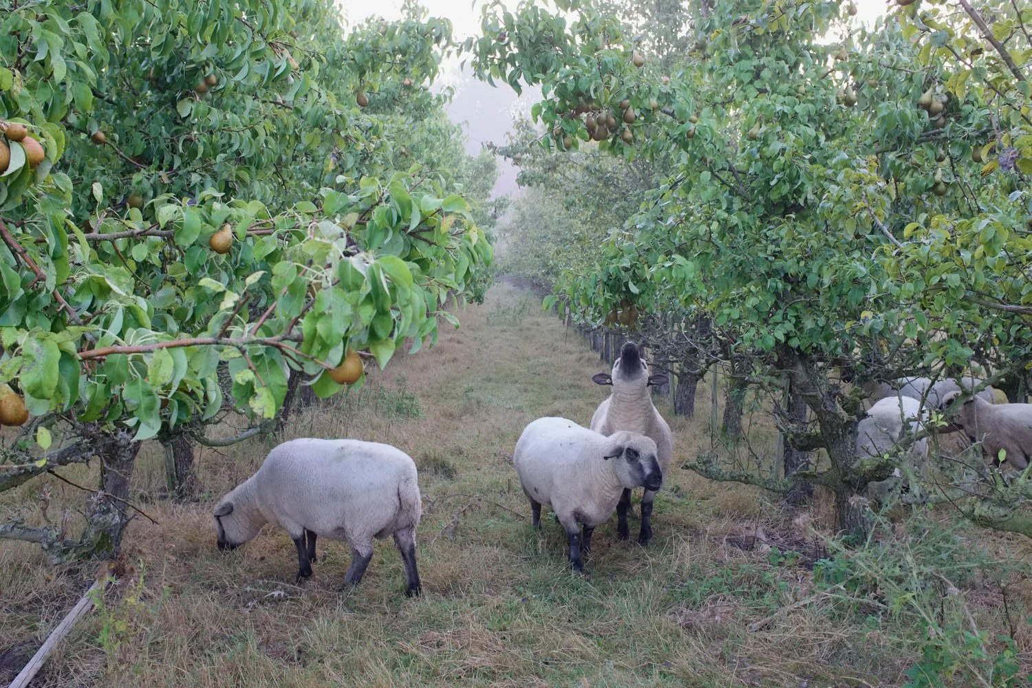 Hampshire Down sheep graze in the uncleared section of the old pear orchard of the Proeftuin van Linschoten. They keep the grass short and mostly free of weeds, with the exception of nettles. Their droppings fertilize the soil. The pears will be harvested in the fall and juiced.