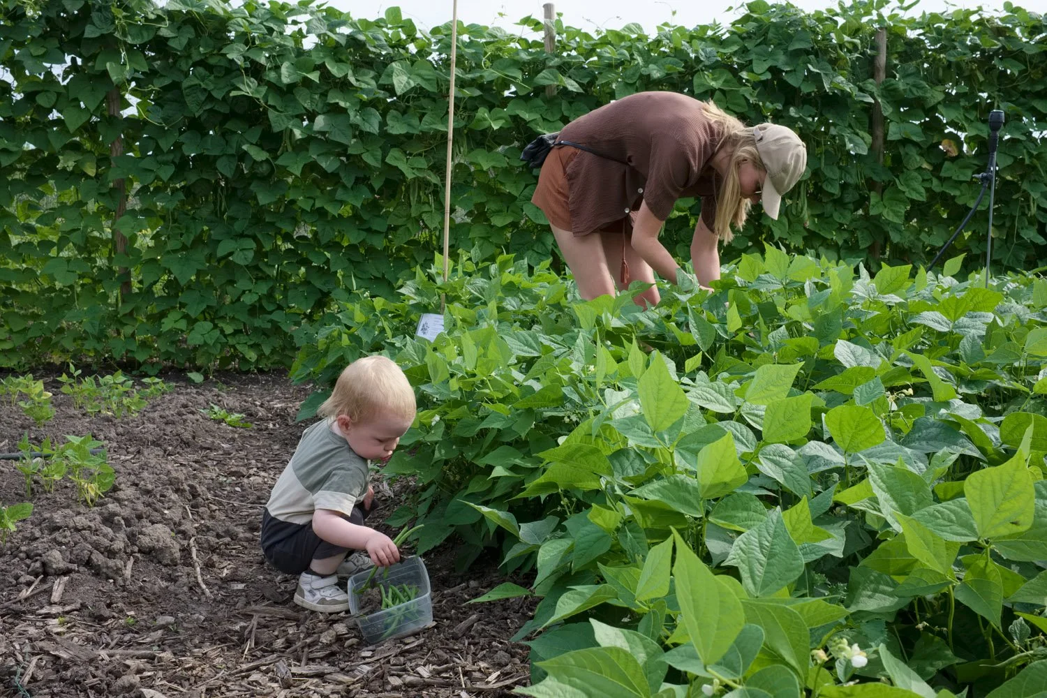 Vegetable subscriber Cindy and her son Luca collect their weekly share. July 2024