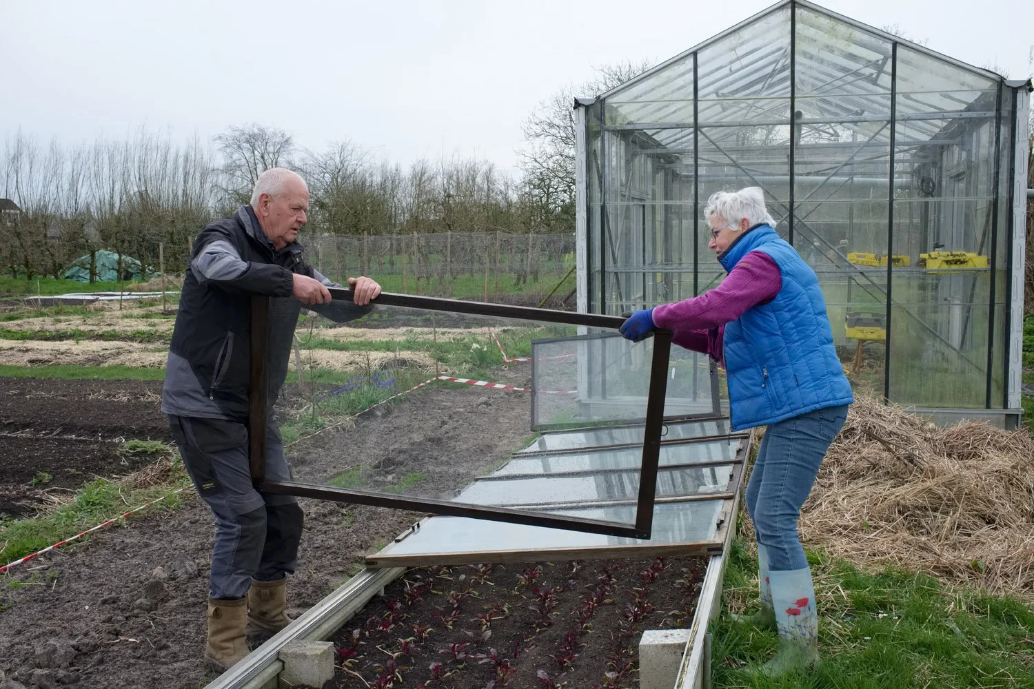 Volunteers Maarten and Jannie replace glass windows on two low greenhouses, after they have been painted and fitted with handles. March 2024