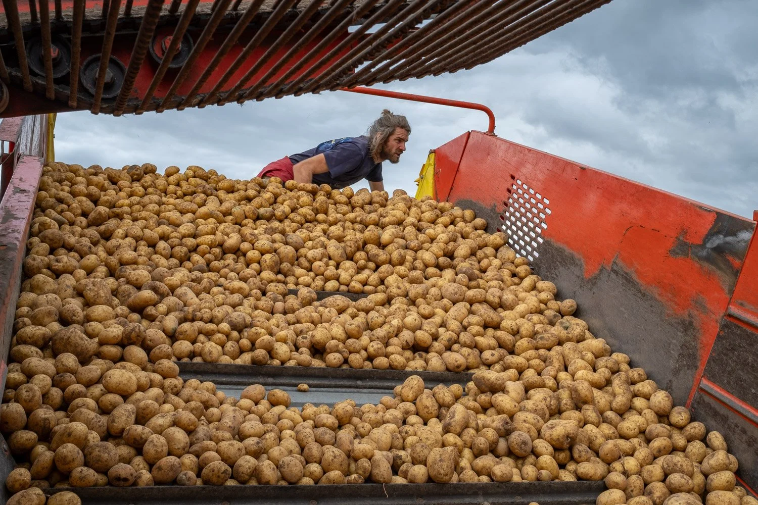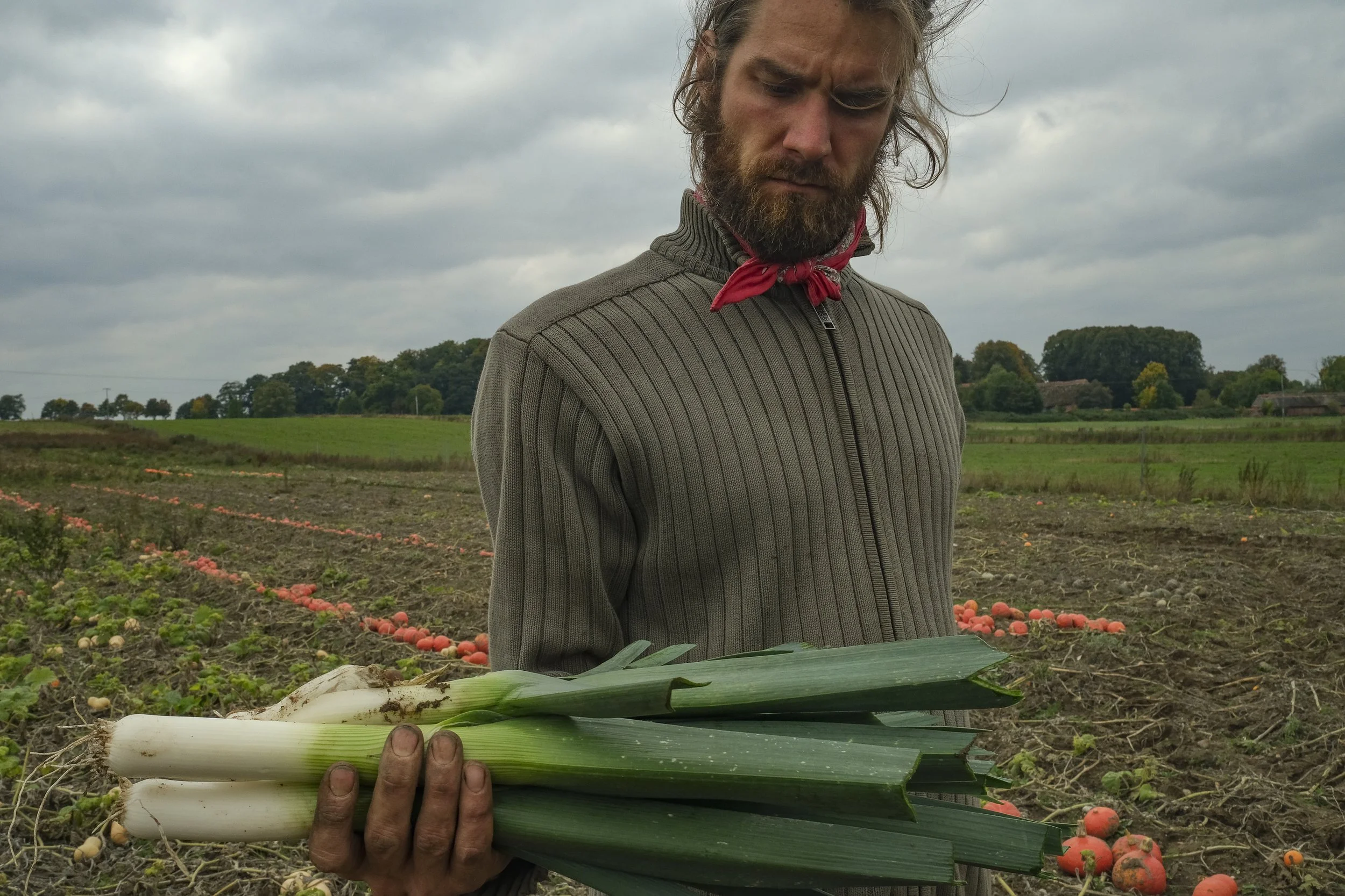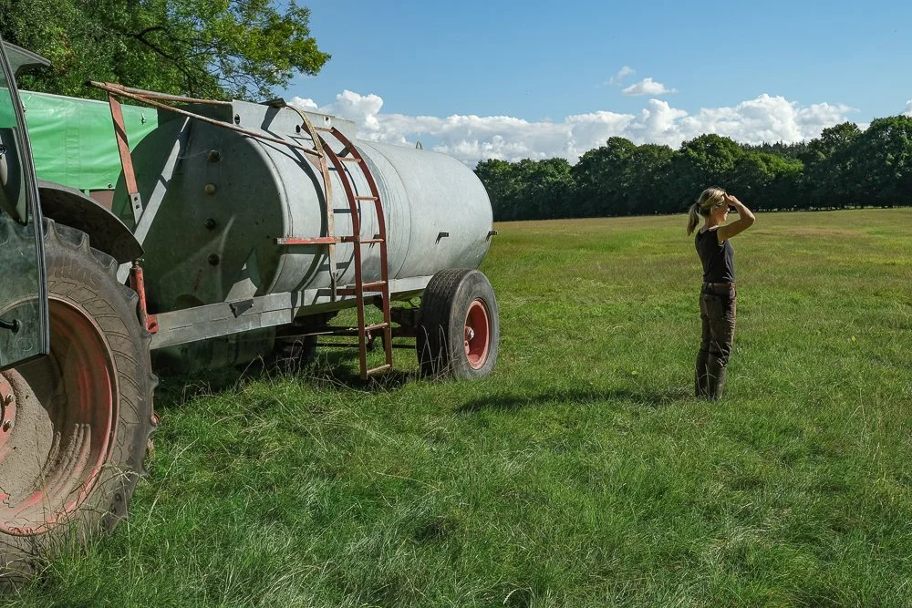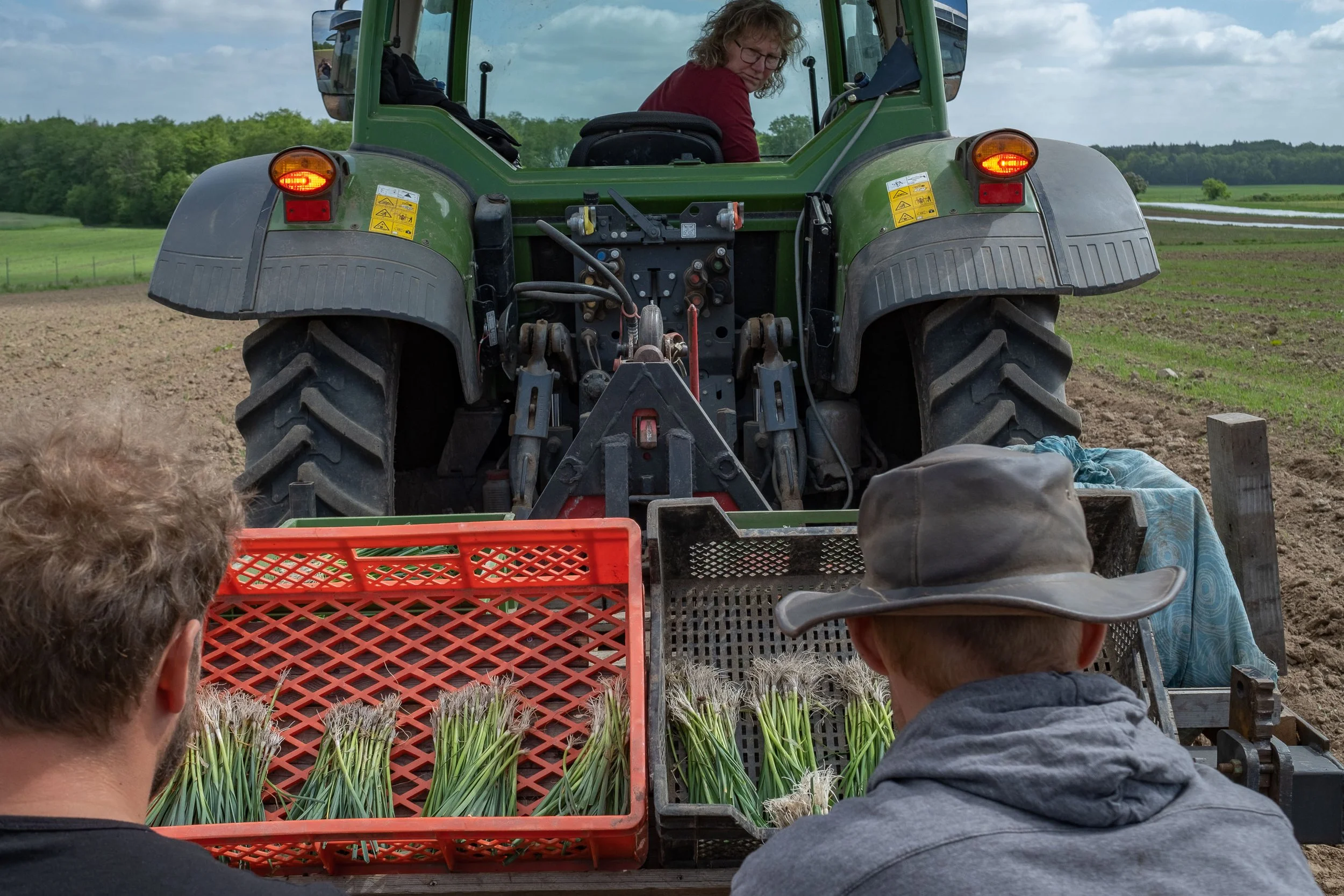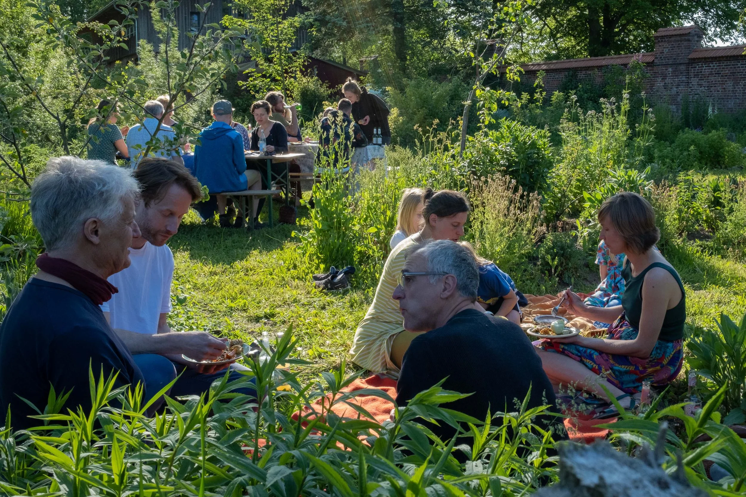 Outdoor lunch with the farmers’ team during the potato harvest in front of the house of farmer Lukas (in the red shirt) and his wife Lena (second photo) who provides for the culinary well-being of the farm workers in Neverstaven and helps wherever womanpower is needed. Lukas and Lena are two of the shareholders of the farm. They have two young sons, Freede and Paale