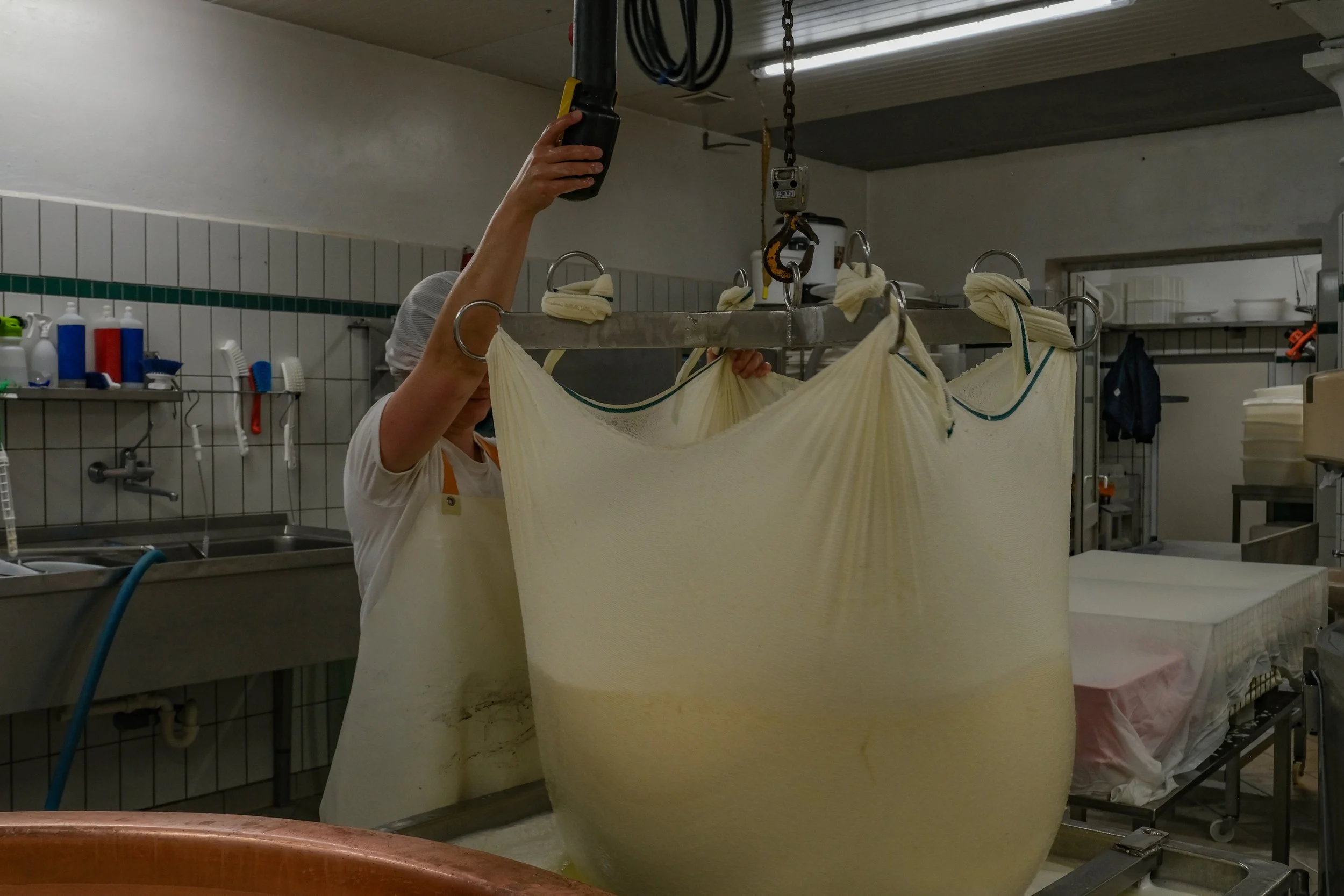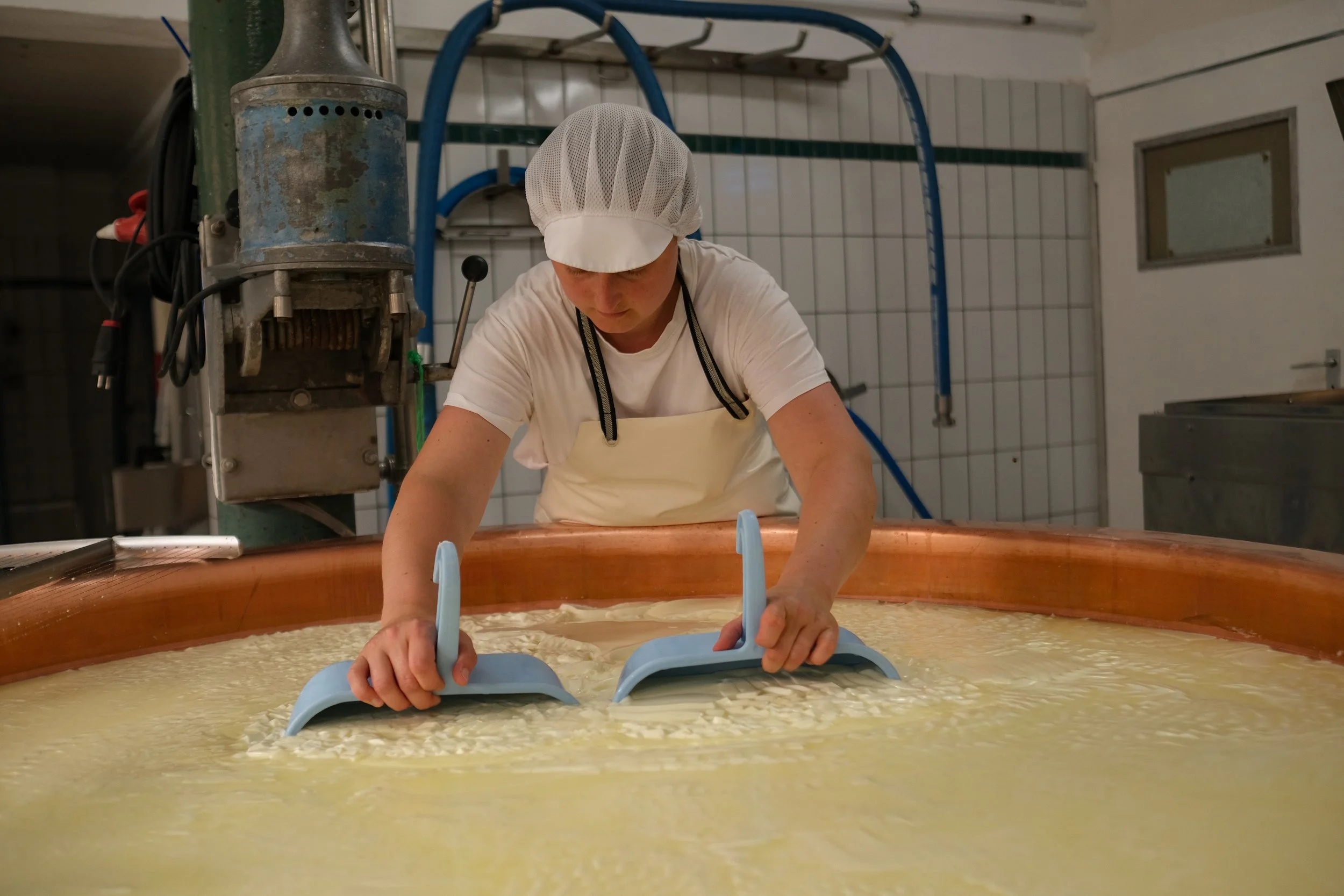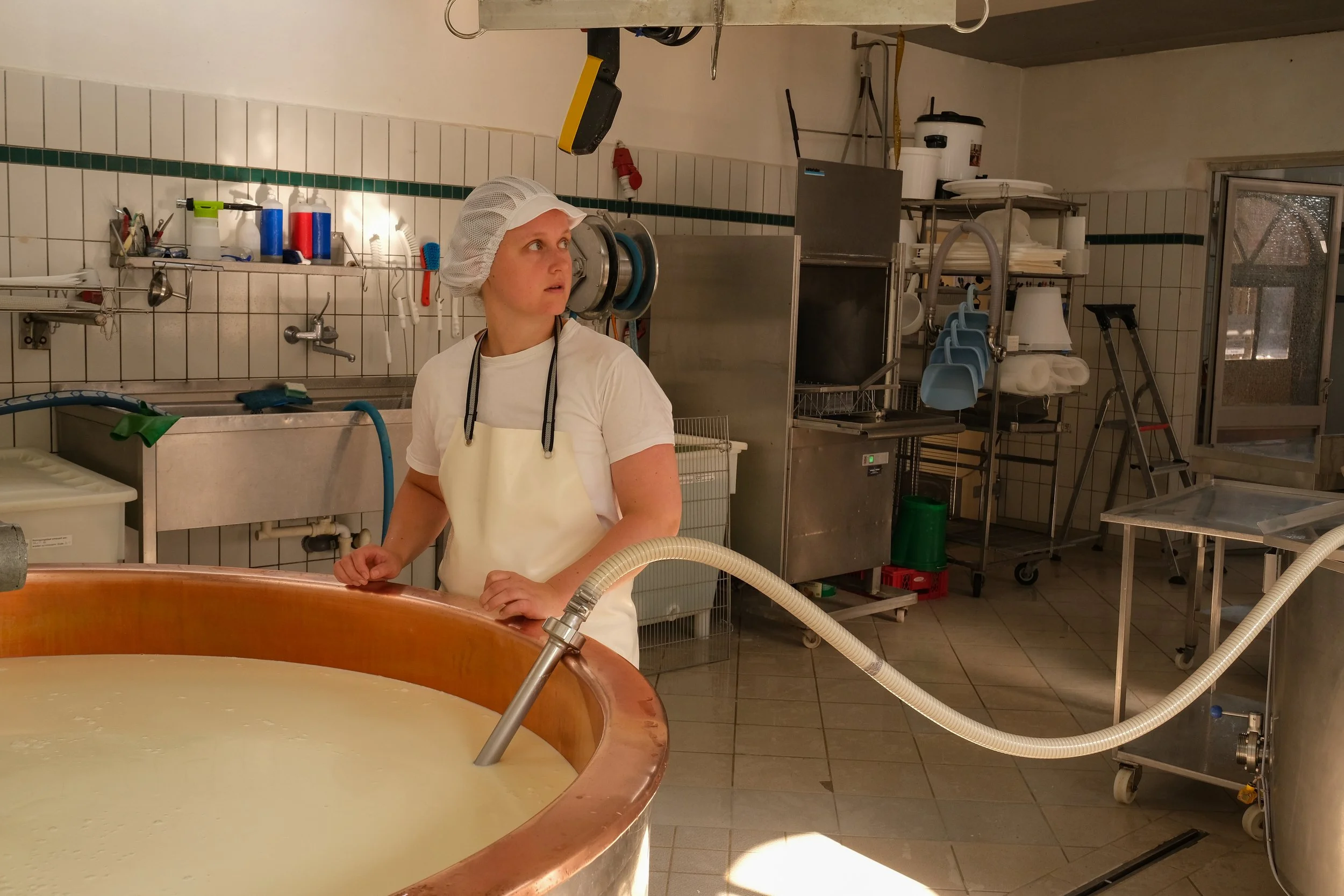Julia Sonnet is the master of cheesemaking. To follow her during the production of mountain cheese is like attending a zen buddhistic lesson. lt takes a whole morning, from the fresh milk running into the copper vat to the pressing of the soft cheese mass into the moulds. After some hours of rest those will be transferred to the farm‘s own maturing cellar where the cheeses will remain for twelve months before being sold in the farm shops. Next to 22 different types of cheese, Julia and her team produce butter, yoghurt, sour cream and curd.